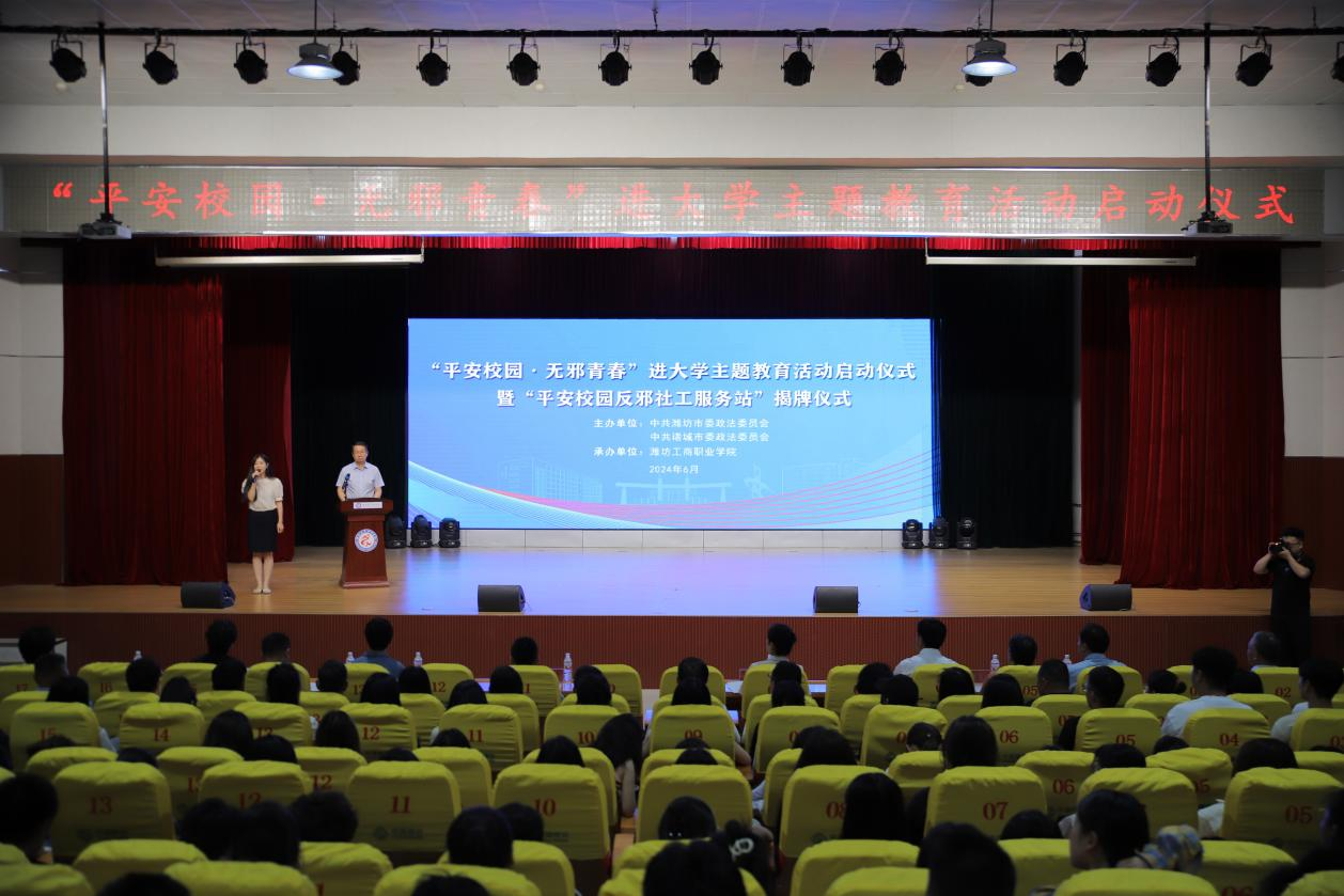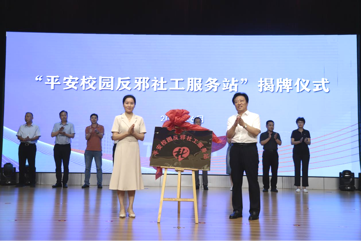 潍坊市委政法委副书记郭璐与潍坊工商职业学院校长张绍秋共同为“平安校园反邪社工服务站”揭牌,标志着服务站正式成立。