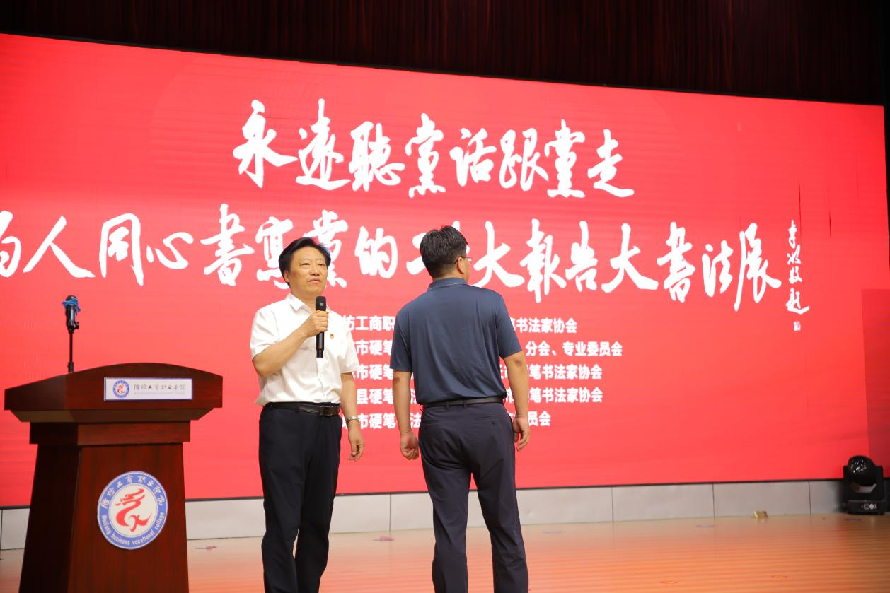 潍坊市硬笔书法家协会会长梁玉国代表协会向我校和诸城王尽美研究会捐赠了书法作品,以此支持红色文化的传播和教育。