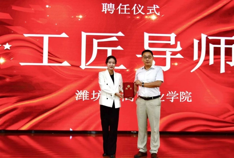 合作办学处(实习实训管理处)处长侯国强代表学校向姜婵颁发工匠导师聘书。