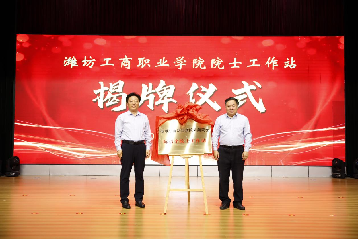 大会进行了揭牌仪式。潍坊市教育局党组副书记、市委教育工委副书记王妍妮和诸城市委常委、宣传部部长、市委教育工委书记、市总工会主席刁立武共同为诸城市域产教联合体揭牌;俄罗斯自然科学院外籍院士陈清奎和我校校长张绍秋共同为潍坊工商职业学院院士工作站揭牌;潍坊市教育局四级主任科员方斌和诸城市教体局党组书记、局长,市委教育工委常务副书记孙加军共同为王浩名和孙秀平两个山东省职业教育技能大师工作室揭牌。