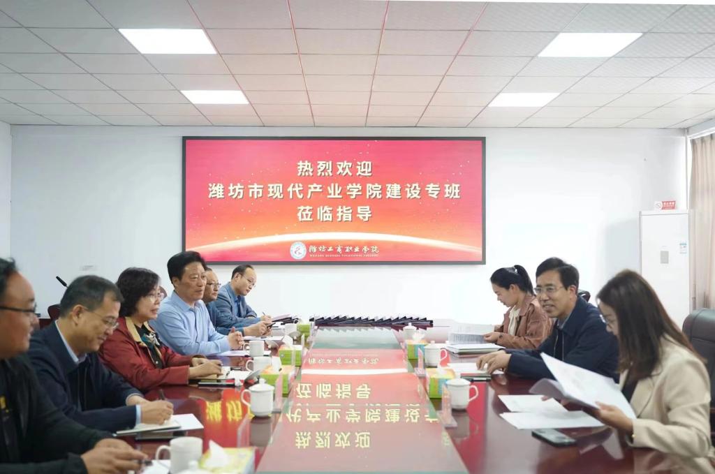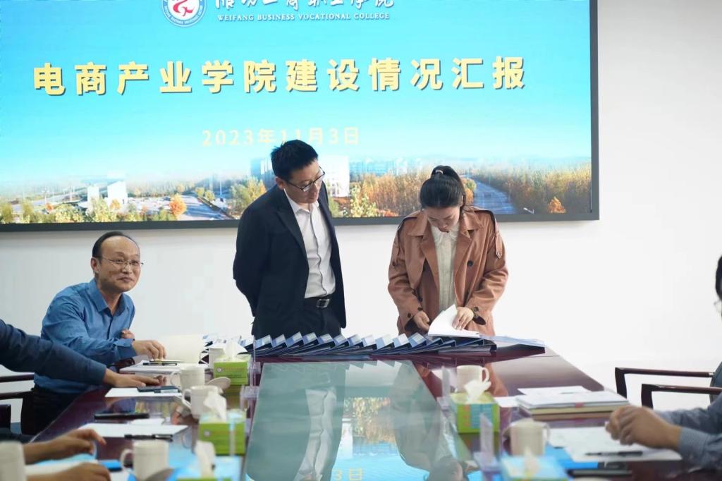 11月3日,为贯彻落实《潍坊市服务现代产业学院建设办法(试行)》的通知精神,深化产教融合、校企合作,由潍坊市产教融合研究院副院长邵长山,潍坊市产教融合研究院校企合作中心主任王丽红,教研员肖晶晶组成的潍坊市现代产业学院建设工作专班办公室专家对潍坊工商职业学院申报的电商现代产业学院项目进行现场考察,市委教育工委副书记王泽琪,市教体局相关科室负责同志陪同。