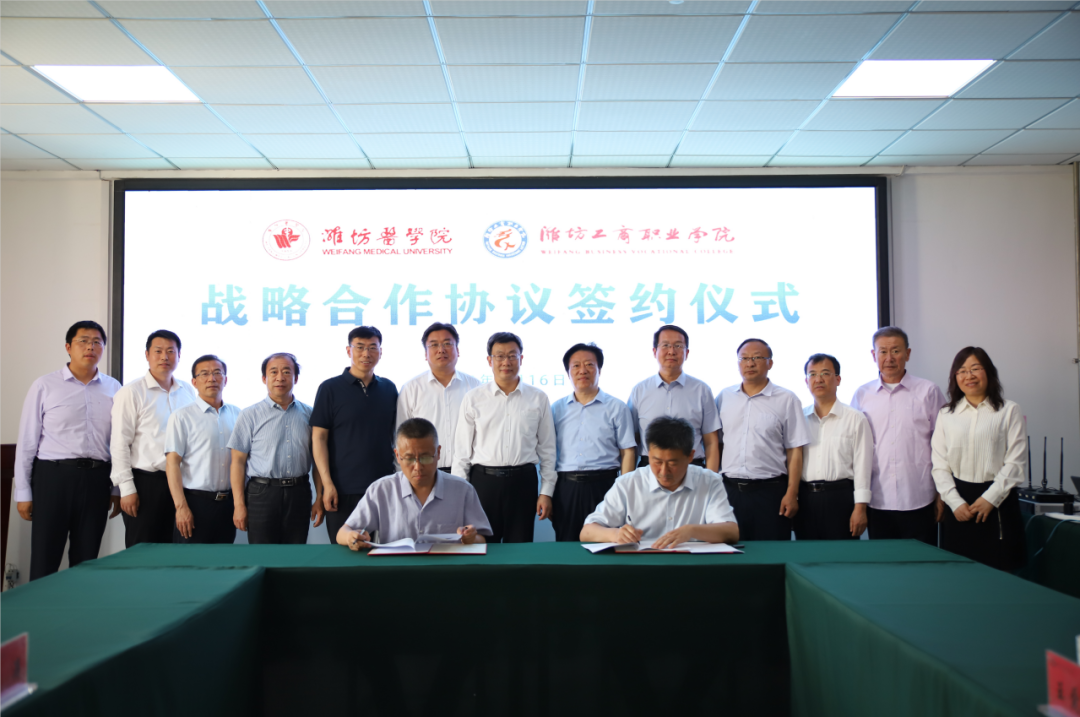 5月16日,潍坊医学院党委书记刘军,党委委员、宣传部部长田玉胜,党委委员、组织部部长王世群等一行7人来我校考察交流并签订战略合作协议。诸城市委常委、宣传部部长、教育工委书记刁立武,诸城市委教育工委常务副书记、市教体局党组书记、局长孙加军,潍坊工商职业学院校长张绍秋,党委书记葛国文,党委常务副书记、执行校长郑志松,副校长唐德良等陪同考察并出席签约仪式。