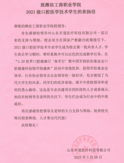 近日,潍坊工商职业学院收到了一封特别的表扬信。信中表扬了2021级口腔医学技术的学生们为“3.20世界口腔健康日‘春牙行’暨中国牙病防治基金会口腔健康科技馆开馆盛典”活动做出的突出贡献,对学校培养优秀人才做出的努力表示肯定和感谢。